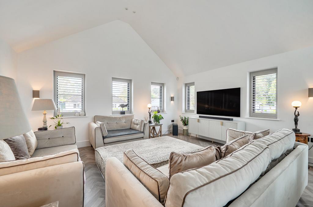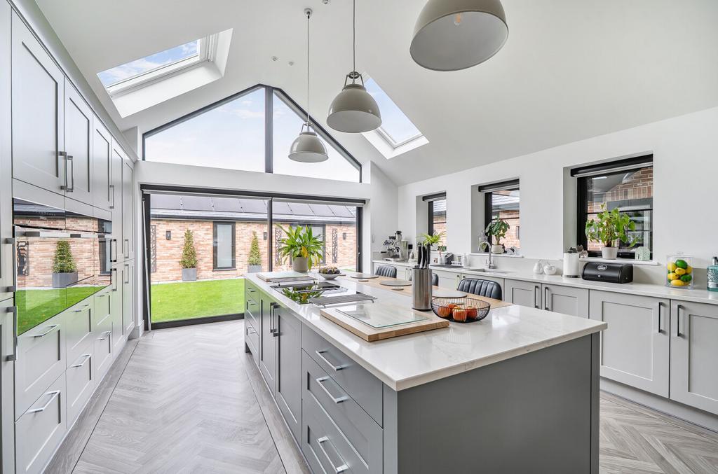 Upon entering the property, you are immediately struck by the impressive reception hall, featuring a vaulted ceiling, herringbone flooring, and expansive glazing that offers views of the attractive garden and courtyard. The space is flooded with natural light, and the hallway provides useful fitted storage for coats and shoes, as well as access to all main rooms. The large, triple-aspect open-plan kitchen, dining, and sitting area serves as the heart of the home. It boasts modern living at its finest, with a generous kitchen island with seating—perfect for cooking and entertaining—alongside a contemporary shaker-style kitchen fitted with an array of integrated Miele appliances, including ovens, a microwave, warming plate, induction hob with integrated extraction, fridge/freezers, and a wine fridge. A door leads to a separate utility room with additional storage cupboards, a convenient WC, and access to the rear garden.