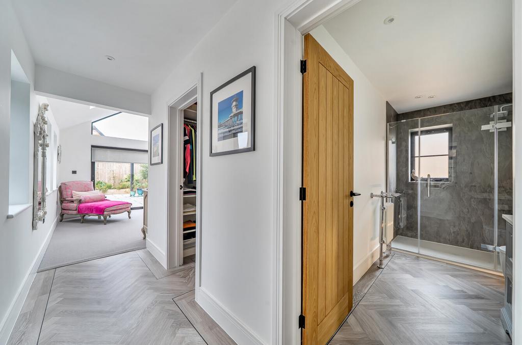 The bedrooms are thoughtfully positioned on the opposite side of the property, providing privacy and comfort. The principal suite is located at the rear and features an impressive vaulted ceiling, large sliding doors opening onto the courtyard, and an electric skylight. Generously proportioned, it includes a walk-in dressing room and a spacious ensuite shower room with a walk-in shower and twin basins. The second bedroom is also sizable and benefits from access to the large family shower room. Additionally, the property offers a substantial walk-in boiler room housing the pressurized water cylinder, as well as a loft hatch with a ladder leading to a generously boarded loft. Sustainable and cost-efficient features include solar panels on the garage and an air source heat pump, making this property economical to run.