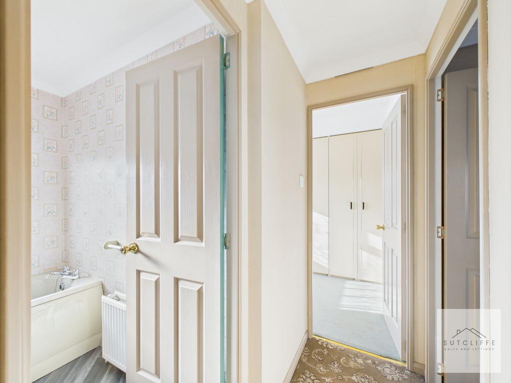 The generous primary bedroom offers a peaceful retreat, beautifully designed to combine comfort and practicality. A large window overlooking the side aspect bathes the room in natural light, creating a bright and welcoming atmosphere. The space easily accommodates a dressing table and features ample sockets for all your modern essentials. A walk-in wardrobe, complete with fitted shelving and hanging rails, provides excellent storage and keeps the room feeling relaxing and clutter-free — a perfect haven to unwind and relax at the end of the day.