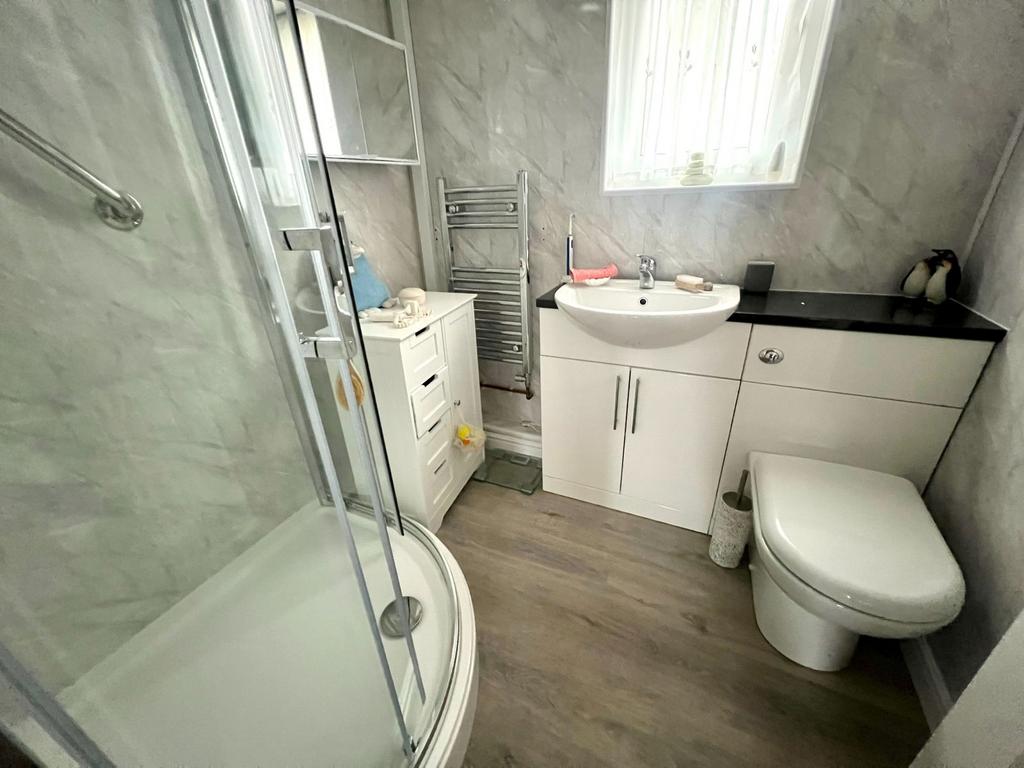 Vanity unit with inset sink and WC, corner shower cubical with glass surround and electric shower, heated towel rail, upvc window to front elevation.