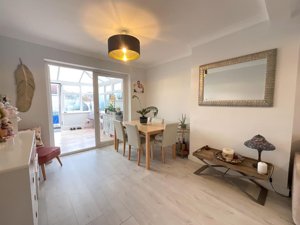 uPVC double glazed double doors opening onto the rear garden with uPVC double glazed windows to three aspects. Further uPVC double glazed door opening to side. Double banked radiator. Oak effect laminate strip wood flooring. High level lipped skirting. Pitched polycarbonate roof. Further doorway through to;