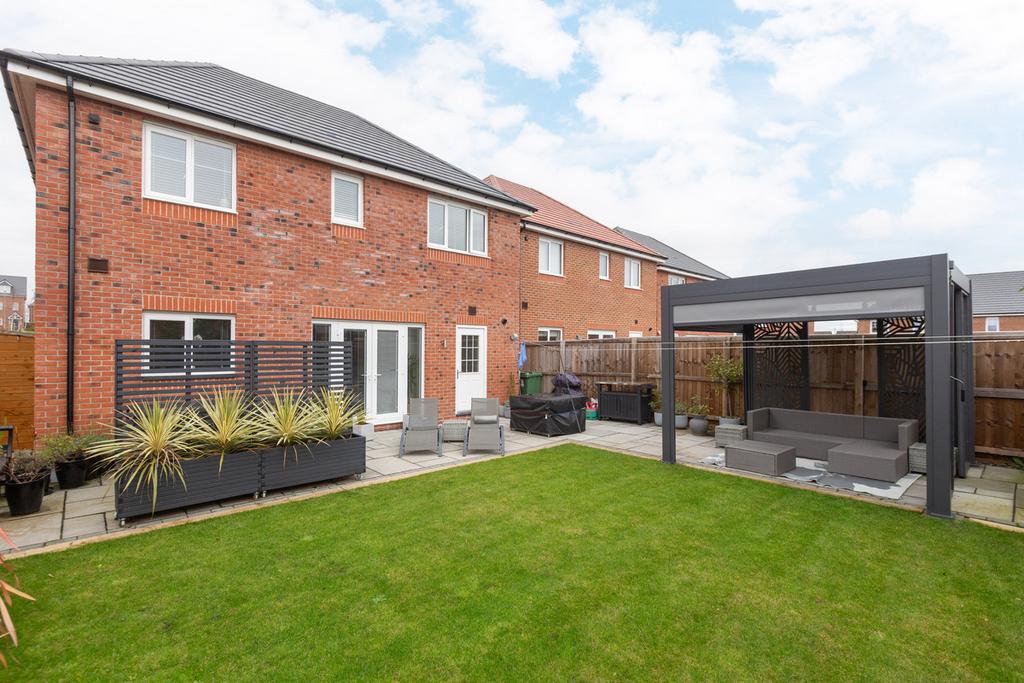 The landscaped rear garden provides an inviting outdoor retreat, designed for both relaxation and entertaining. A spacious paved patio offers plenty of room for outdoor dining and seating, bordered by raised planters filled with mature shrubs. To the rear, a contemporary covered seating area with decorative privacy screens provides a stylish space to unwind, while low-maintenance artificial lawn and gravelled borders complete this beautifully presented outdoor haven.