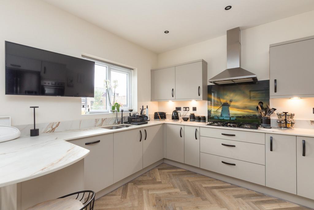 A stunning open-plan kitchen and dining space, ideal for modern family living and entertaining. Fitted with a contemporary range of wall and base units with complementary work surfaces, the kitchen includes an integrated electric oven and grill, five-ring gas hob with stainless steel extractor, integrated dishwasher, and space for an American-style fridge freezer. Additional highlights include under-cabinet lighting, inset stainless steel sink with mixer tap, soft-close drawers, and vertical radiator.
