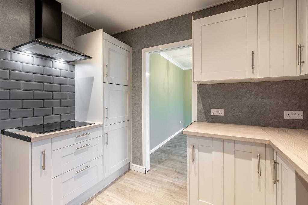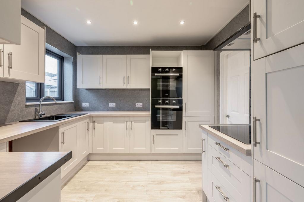 At the heart of the home, the kitchen has been newly fitted with white shaker-style cabinetry, light wood-effect work surfaces, and sleek grey splashbacks. Integrated appliances include a double electric oven, induction hob with stainless steel extractor, and an inset stainless steel sink placed beneath a large window overlooking the rear garden. Recessed ceiling spotlights and matching wood-style flooring create a clean, contemporary finish.