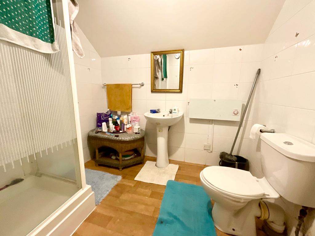 Tiled shower cubicle with Neptune electric shower, pedestal basin and fully tiled walls.