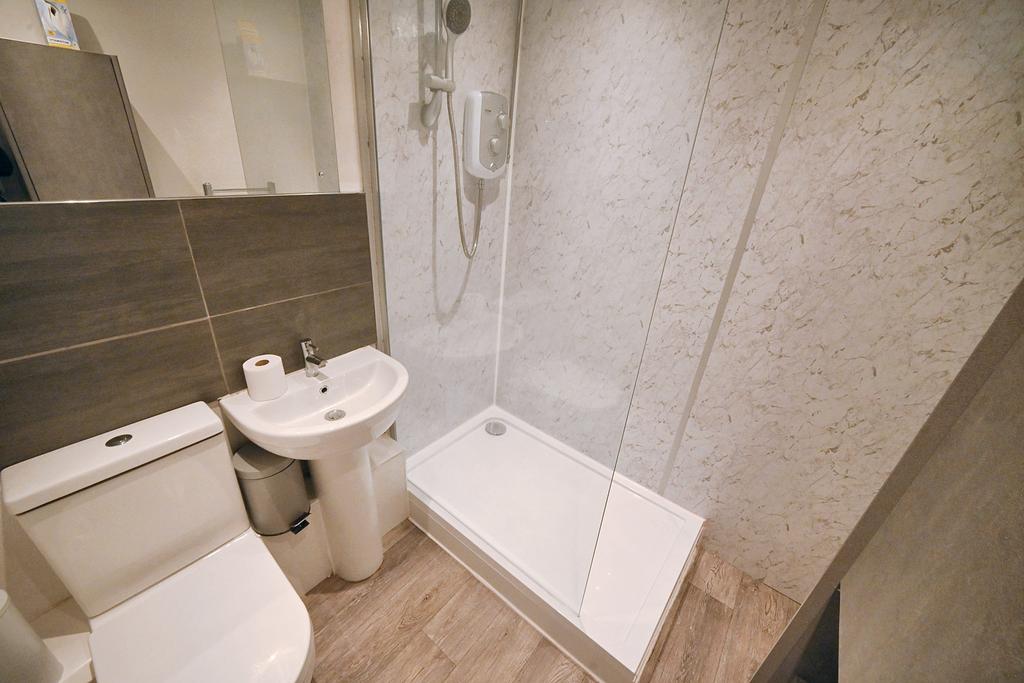 Bathroom: 6’1’’ (1.85m) x 5’10’’ (1.77m) White suite with corner shower cubicle, pedestal wash hand basin, low level WC, part tiled walls, laminate style vinyl flooring, recessed ceiling spot lights and extractor fan.
