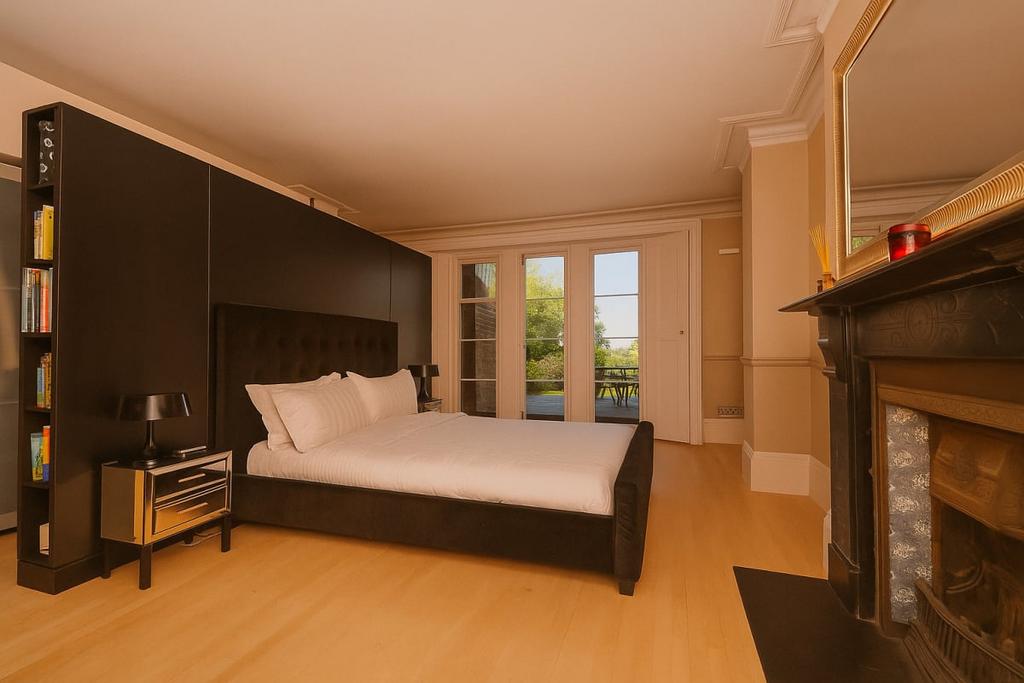 The raised ground floor features a magnificent double reception room with high ceilings, tall sash windows, and French doors opening onto a balcony overlooking the garden. The space is perfect for both entertaining and family living, with oak floors, a decorative period fireplace, and abundant natural light throughout. The adjoining kitchen is fully fitted with shaker-style cabinetry, black granite worktops, and integrated appliances. On the lower ground floor are three generous bedrooms, each with access to or outlooks over the garden. The principal bedroom suite includes a luxurious ensuite bathroom with a freestanding tub and separate shower, while the second bedroom also benefits from an ensuite. A third family bathroom serves the remaining bedroom. A practical utility room and vault storage complete this floor.