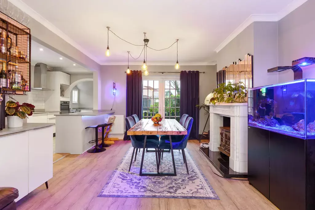 Upon entering, a welcoming hallway greets you, featuring a useful storage cupboard and a beautiful stained glass window, adding a touch of period charm. The heart of the home is the stunning open-plan living, dining, and kitchen area — a superb space for modern family living and entertaining. The kitchen seamlessly opens into a utility room and a cloakroom (WC), offering both convenience and functionality.