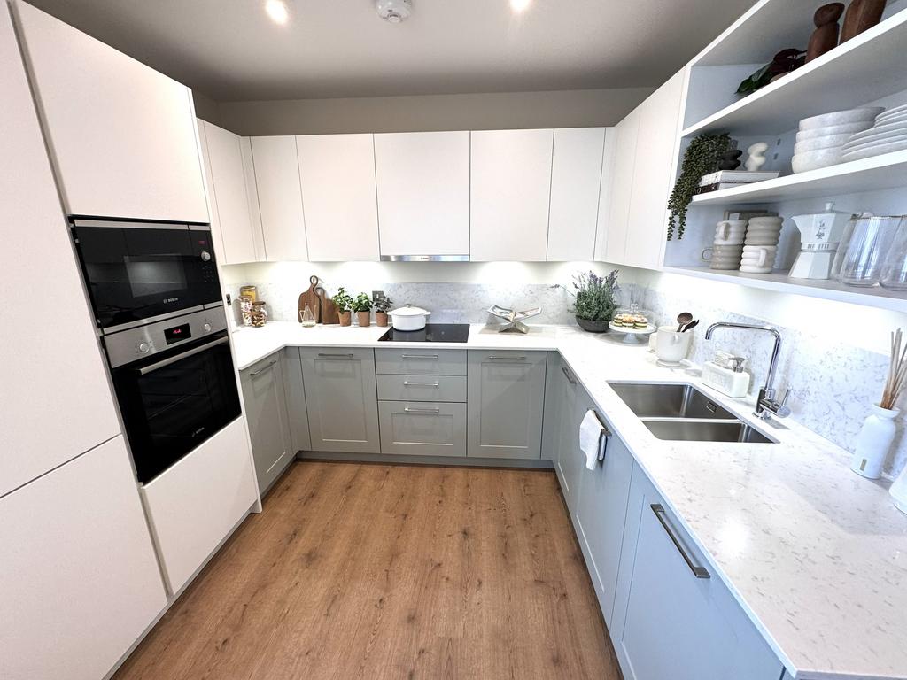 Inside, an open-plan living and dining area leads to a contemporary kitchen fitted with premium integrated Bosch appliances. Two generous bedrooms include a principal bedroom with fitted wardrobes and an en-suite, plus a second bathroom with modern finishes.
