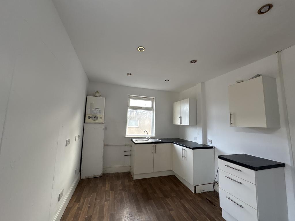 Accessed via a shared main entrance, the property opens to its own private staircase leading to the flat. At the front, a generously sized living room features large windows that let in plenty of natural light. To the rear, you will find a well-proportioned kitchen.