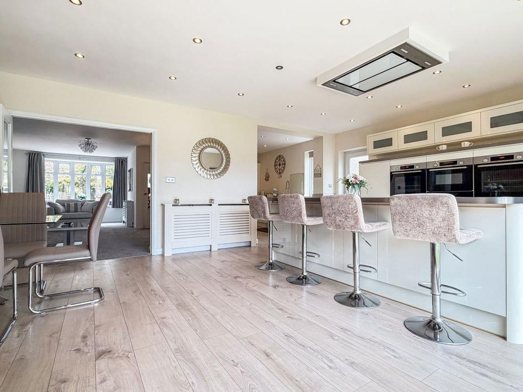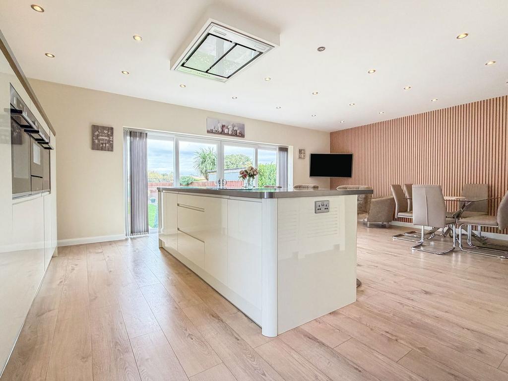 At the rear, the extended open-plan dining/kitchen/family room forms the heart of the house. Stylishly designed with a central island providing additional workspace, storage, and informal seating, this space is perfect for family life or entertaining. A full suite of integrated appliances, including twin ovens, microwave, ceramic hob, and larger-than-standard fridge and freezer, ensures the kitchen is both practical and high-spec. Sliding doors open directly onto the rear garden, extending the living space outdoors and creating a lovely sense of flow.