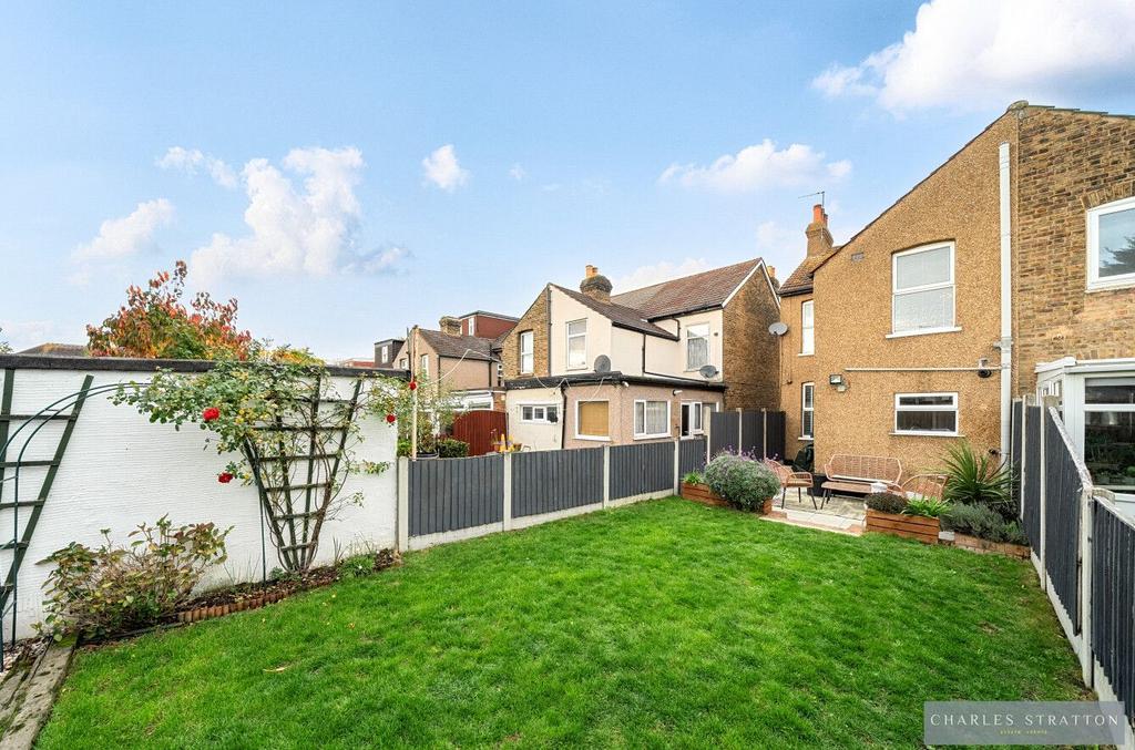 To the rear, the garden is mainly lawned with a patio area, fenced borders and side access.