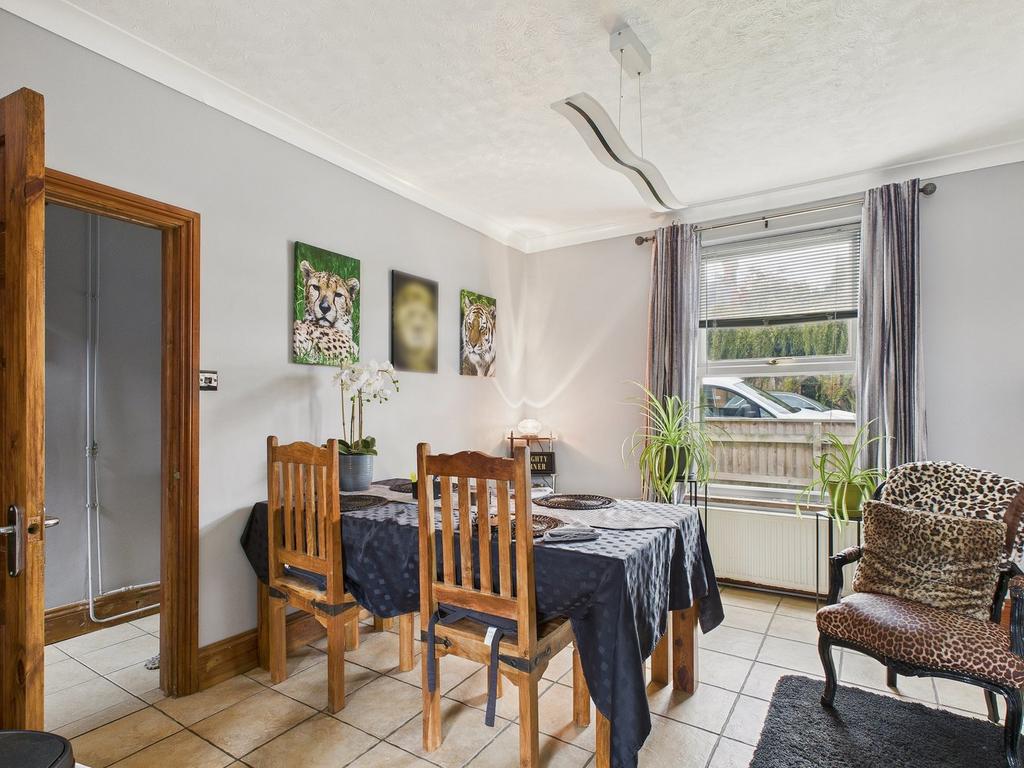 Range of wall and base units with worktop over, space for washing machine, free standing cooker, extractor, uPVC double glazed window to front, gas boiler, opening through to dining area with tiled flooring, uPVC window to front and side, wall mounted radiator.