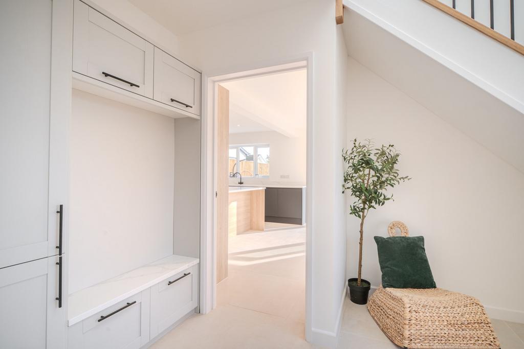 The welcoming hallway features an oak staircase leading to the first floor, where you’ll find four double bedrooms, all fitted with solar blinds, plus a modern family bathroom and a stylish en-suite to the main bedroom. Built with energy efficiency in mind, this home combines comfort, practicality, and contemporary design.