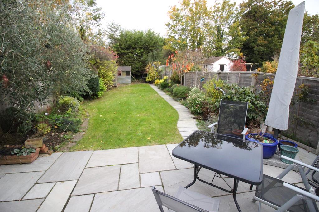 Extending to 80FT being west facing mainly laid to lawn with flower bed borders and screening fir trees, paved patio area, timber garden sheds, side access, water tap.