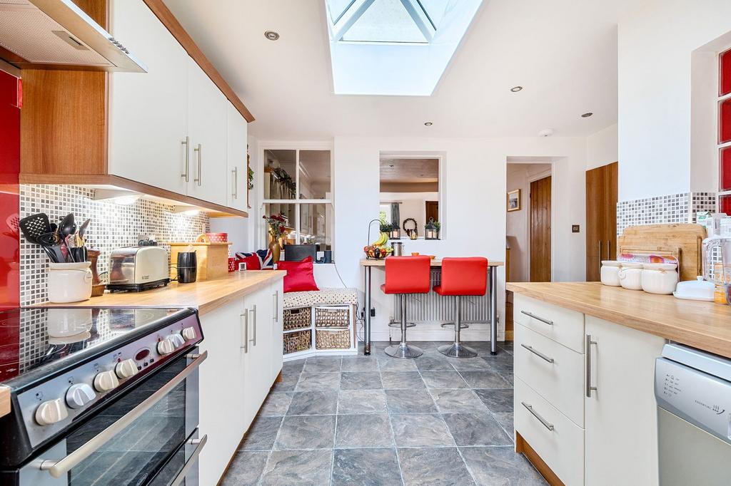 Step down into kitchen/breakfast room with a range of base and wall units with laminate worktops over, breakfast bar, 1½ bowl stainless steel sink with mixer taps, space for electric cooker with extractor unit over, space for upright fridge/freezer, canopy skylight and uPVC stable door to rear garden. Door into cloakroom/utility room with low flush WC, pedestal wash hand basin, space and plumbing for washing machine and tumble dryer.