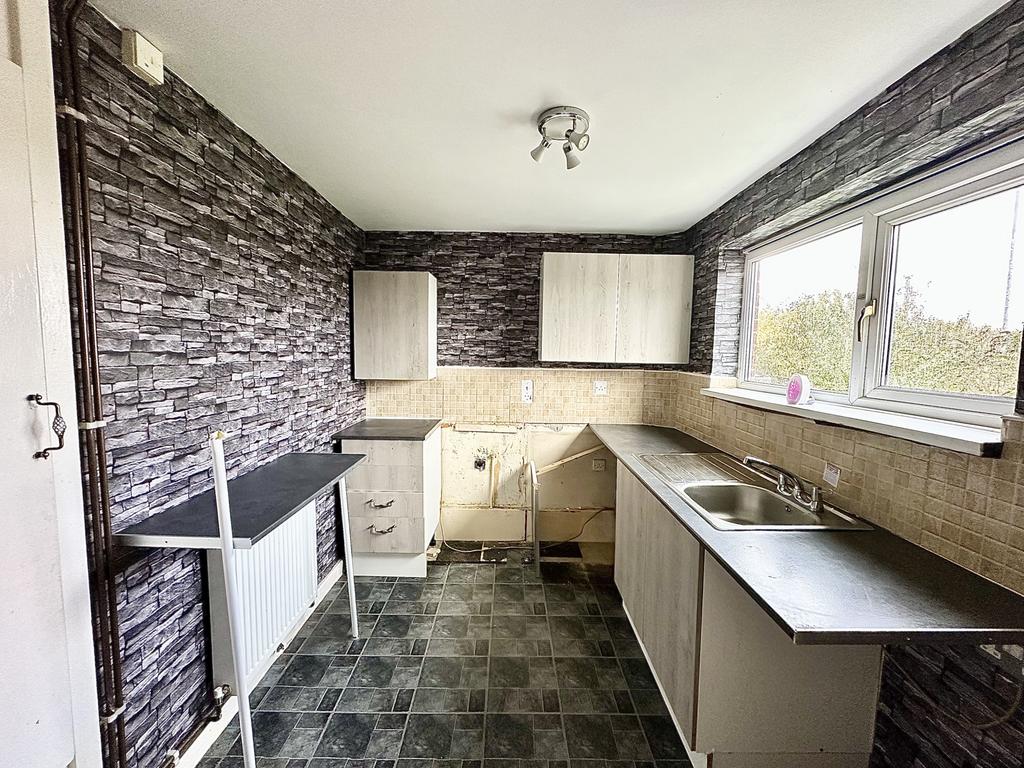 Ceiling light point, double glazed window, radiator, wall and base units with contrasting work surfaces, sink and drainer, space for washing machine, space for fridge / freezer and a storage cupboard.