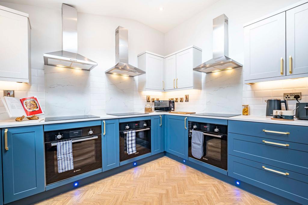 Open plan, fully equipped kitchen & co-living space. The kitchen benefits from three ovens and hobs, dishwasher, sink and washing up area, two large fridges, all crockery/pots & pans, toaster, kettle, and plenty of worktop space. In the living area there is an extendable table and chairs to seat up to 10 people, sofa, coffee table and large wall mounted TV.