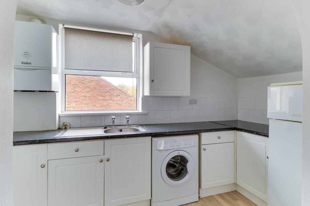 Textured ceiling, UPVC double-glazed window, a range of wall and base-mounted units with roll-top work surfaces over, inset sink and drainer, tiled splash back, cooker, space for appliances and vinyl flooring.