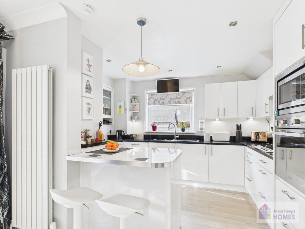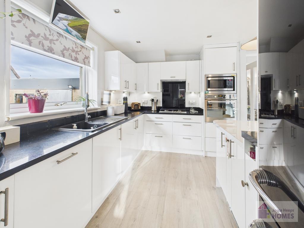 The very well-equipped kitchen overlooks the rear and side of the property. It has contemporary style cabinets and includes the integrated electric oven, gas hob, microwave, washer dryer, and freestanding fridge freezer.