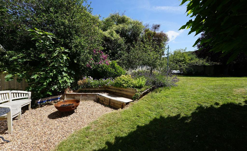 Here, a paved terrace adjoins the living room and leads to a lawn having a backdrop of a rockery border and established trees, shrubs and bushes that, while mature, are easy to keep and provide just the right mix of light and shade. A secluded gravelled terrace is also set away to one side, the ideal place for a fire pit and evening drinks.