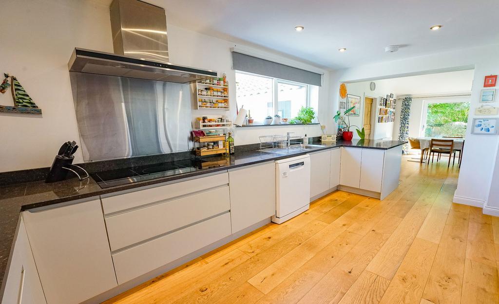 A peninsula breakfast bar with provision for stools partially divides the kitchen area from the very attractive double aspect family room-dining room, though both areas are visually linked by the continuous oak flooring.