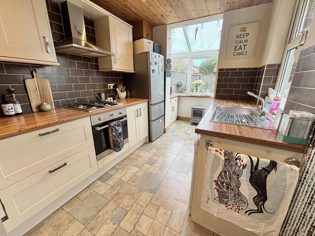 UPVC windows and door leading to rear garden, fitted kitchen with a range of wall and base units with complimentary work surfaces, space for under the counter dish washer, washing machine, free standing fridge/freezer, integrated oven with gas hob and extractor over.