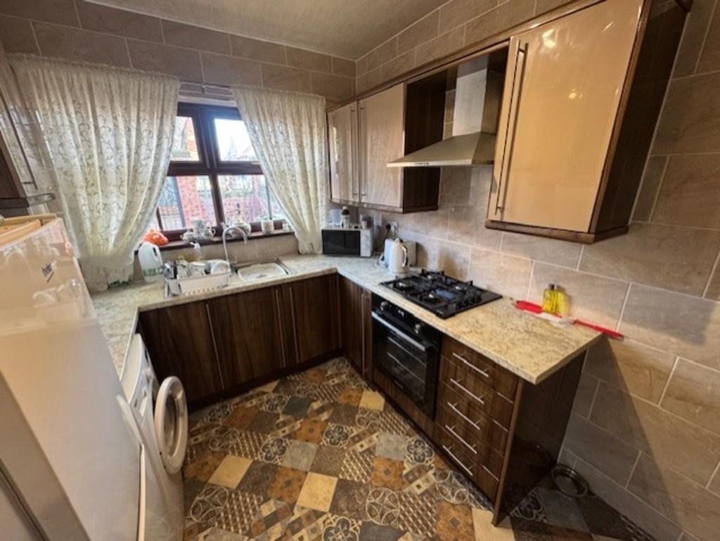 KITCHEN 9' 9" x 8' 8" (2.97m x 2.64m) Having a range of base and wall units with work surfaces incorporating a stainless steel sink and drainer with mixer tap. Built in Kenwood gas oven and Bosch 4 ring gas hob with chimney style extractor hood above. Plumbing/space for washer. Fully tiled walls and vinyl flooring. Radiator and wall mounted Baxi combi boiler. Window to the rear and door to the porch.