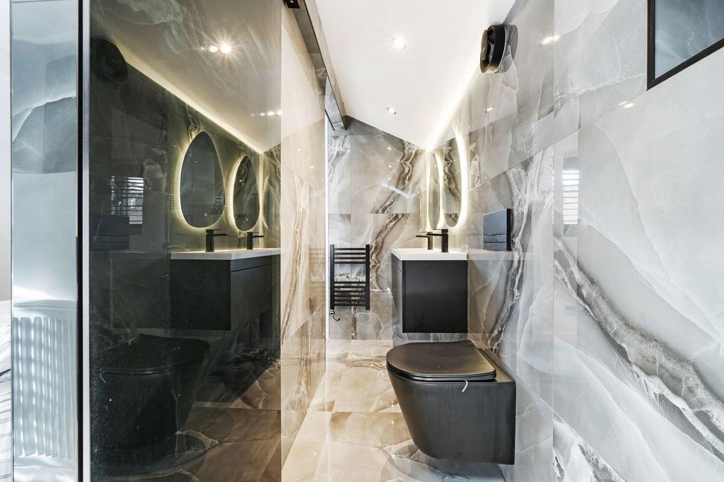 Inside, the current owners have taken the concept of 'property renovation' to a different level - extensions, reconfiguration and a meticulous finish have created a functional layout with an unmistakably high-end feel. The hub of the home is the kitchen, finished in solid quartz with a waterfall island that adds storage, prep space and a tangible sense of quality as soon as you walk in. The quartz continues up the splashback, behind a heat-proof, built-in TV and discreetly integrated wall speakers, turning cooking and entertaining into an experience rather than a chore. Expect built-in NEFF appliances, a proper pantry and a separate utility space to keep the carnage of everyday life neatly out of sight. A stylish ground-floor bathroom can be accessed beyond the utility room, again finished to an uncompromisingly high finish, featuring a free-standing bath tub.