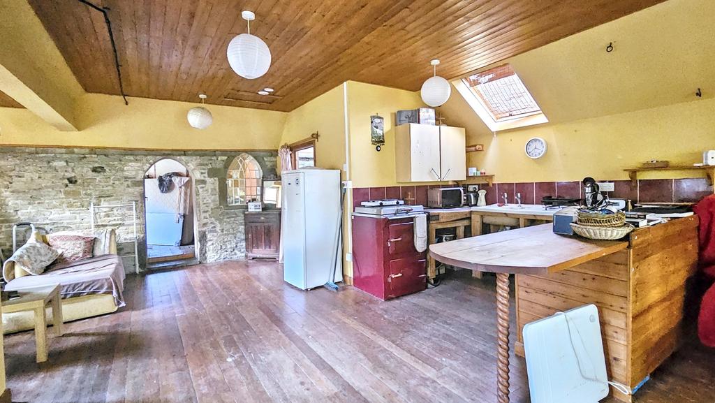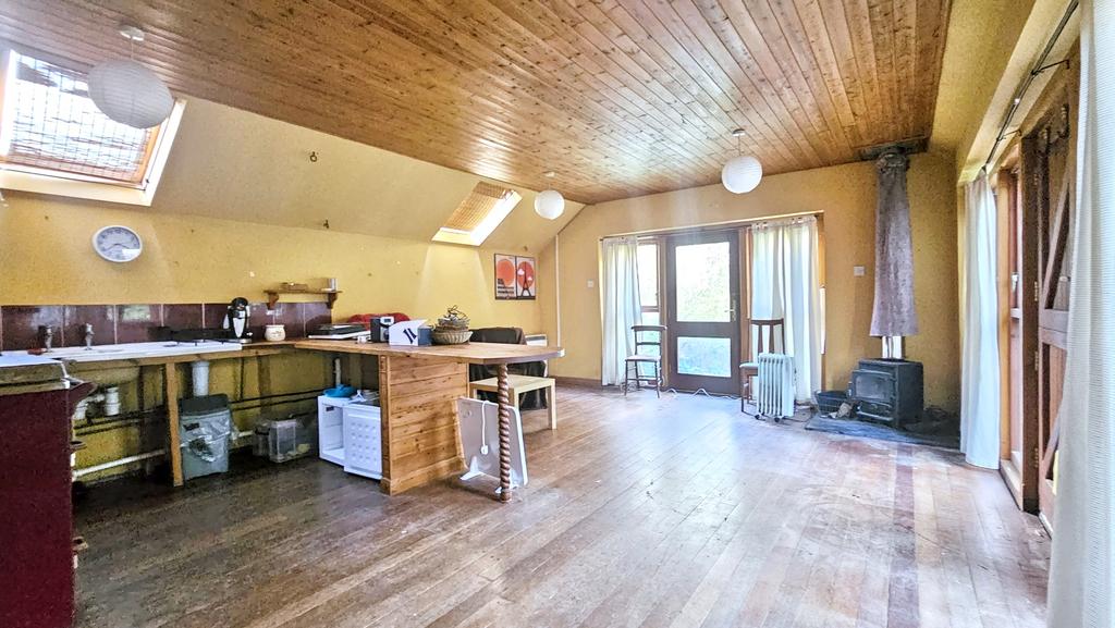 Spacious SELF-CONTAINED ANNEXE with KITCHEN AND LIVING AREAS comprising wood boarded floor, and panelled ceiling, kitchen area with breakfast bar, wall shelves and sink unit. Night-storage-heater, log burner, two skylight windows,