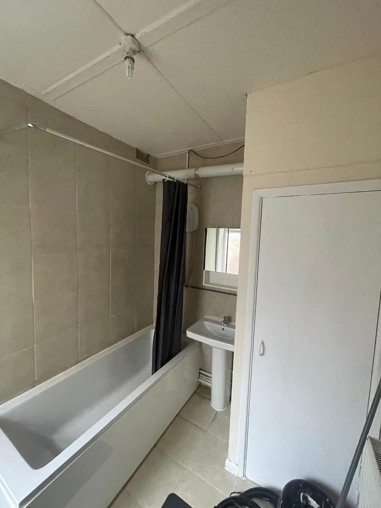 The modern bathroom features stylish, neutral tiling, a three-piece suite including a full-sized bathtub with fitted shower curtain rail, and a pedestal wash basin—providing an inviting spot to unwind at the end of the day. The bedroom is generously sized, brightened by a wide window, and enjoys a peaceful outlook.