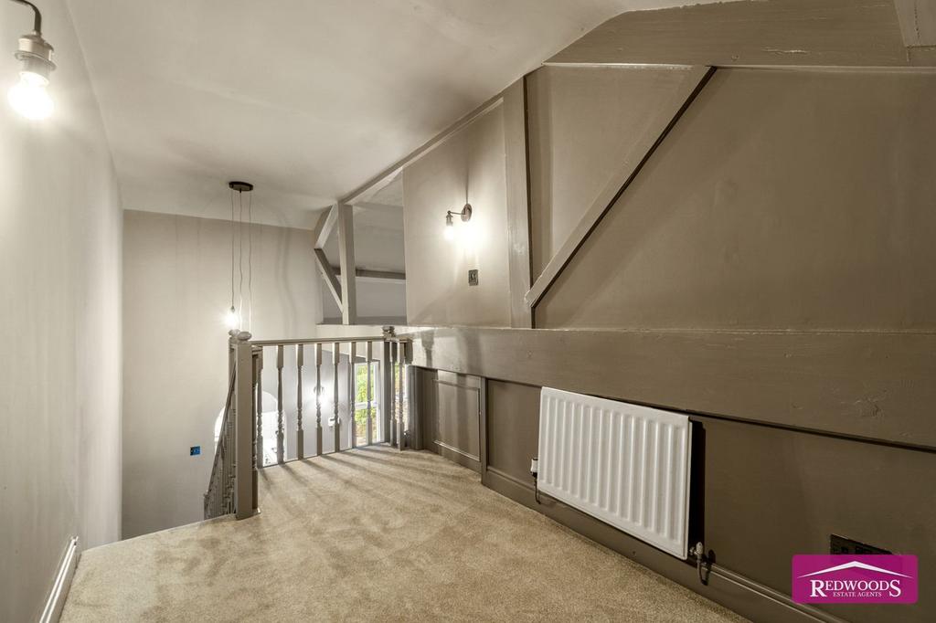 With spindle balustrade and single radiator. Access to loft space housing combination gas central heating boiler.