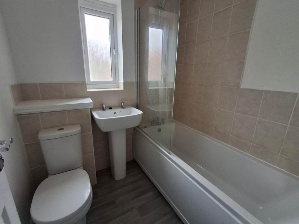 Pedestal wash hand basin, panel bath with mixer tap and shower attachment, shower screen, closed couple WC, radiator, part tiled