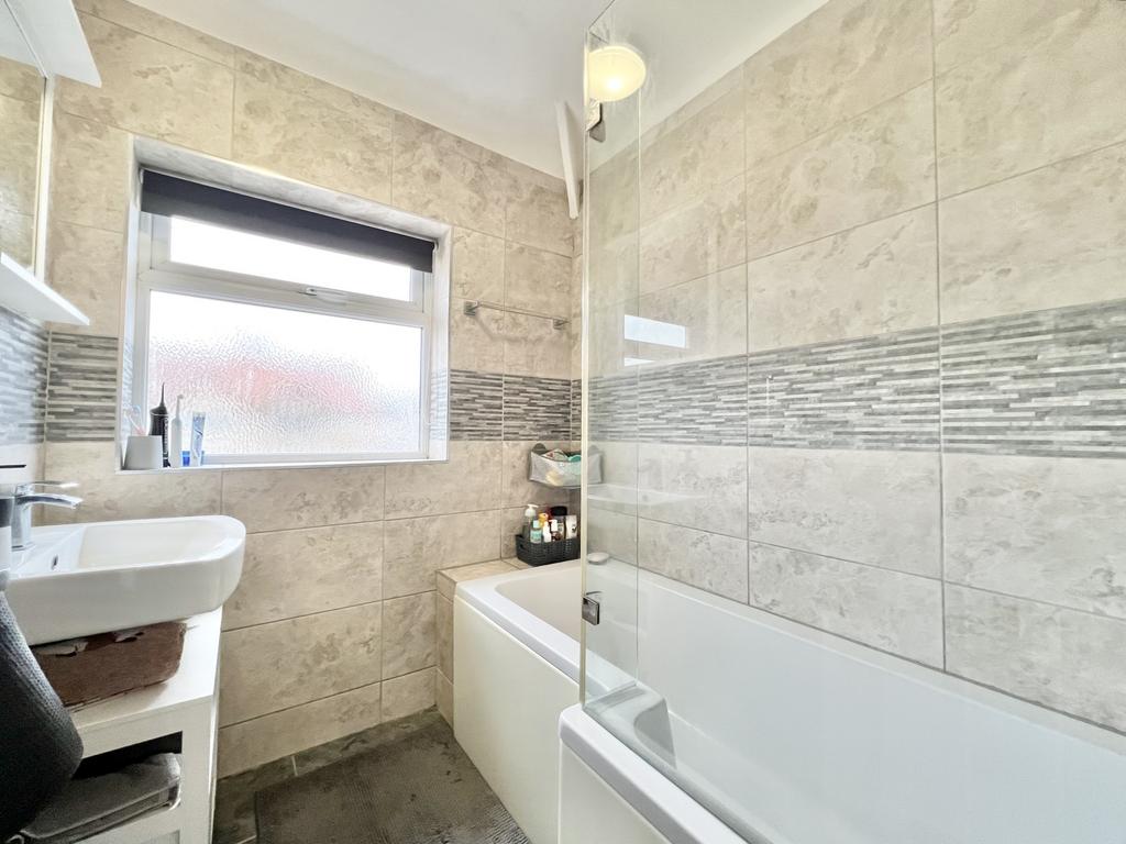 UPVC double glazed window to the front aspect. Modern fitted two piece suite comprising; panelled bath with shower attachment over, wash hand basin and wall mounted towel rail.
