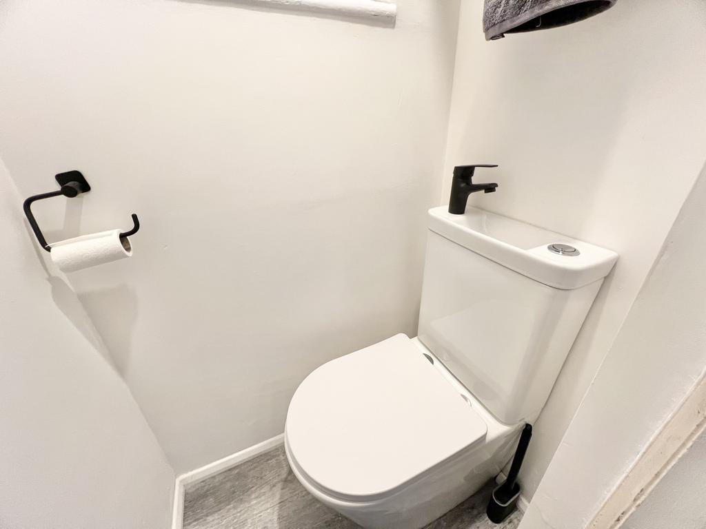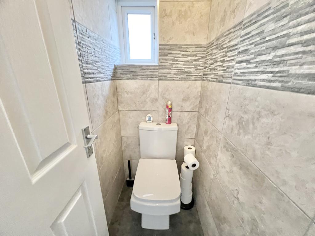 UPVC double glazed window to the side aspect, low flush wc and wash hand basin.