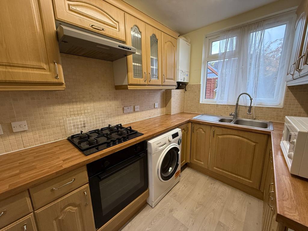 9' 0" x 6' 3" (2.74m x 1.91m) Matching wall and base units, oven, gas hob, extractor, one and a half stainless steel sink, plumbed for washing machine, window to rear.