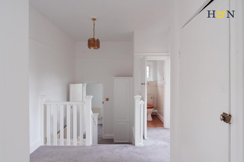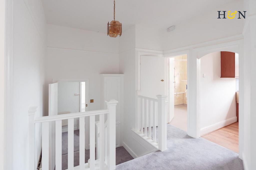 The layout of the flat is both practical and appealing, with a split-level landing that leads to a well-appointed kitchen that has appliances, two bedrooms with built-in storage on one side, and two additional bedrooms on the other. One of these bedrooms benefits from an ensuite shower room, providing added privacy and convenience.