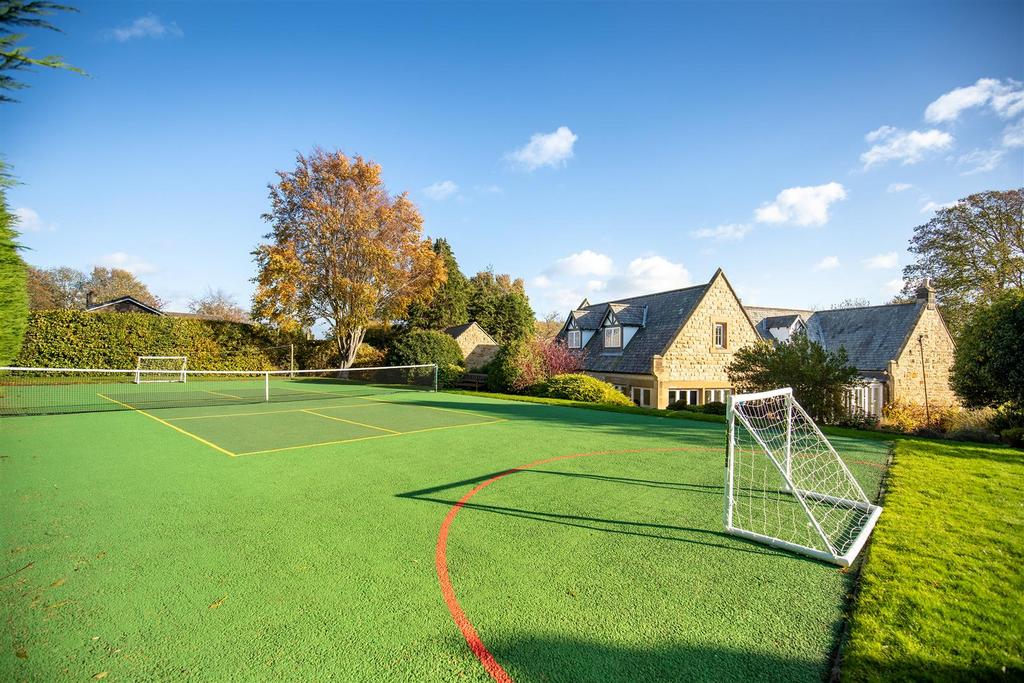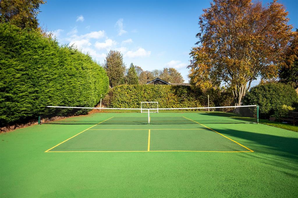 Steps lead to a renewed full-size tennis court, currently set out as a pickleball court. A timber store, formerly used as dog kennels, now provides additional garden storage. The gardens wrap around the property to a secondary enclosed terrace before returning to the garage and driveway. The driveway also provides a recently fitted electronic car charging port which is located adjacent to the garage.