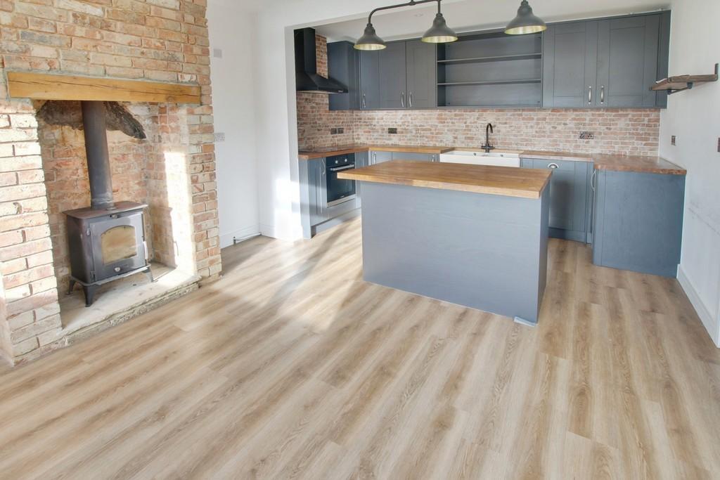 Refitted with wall and base units with wooden worktops and central island, integral oven, hob, hood and dishwasher, double butler sink with mixer tap, exposed brick fireplace with log burner, window to front and side.