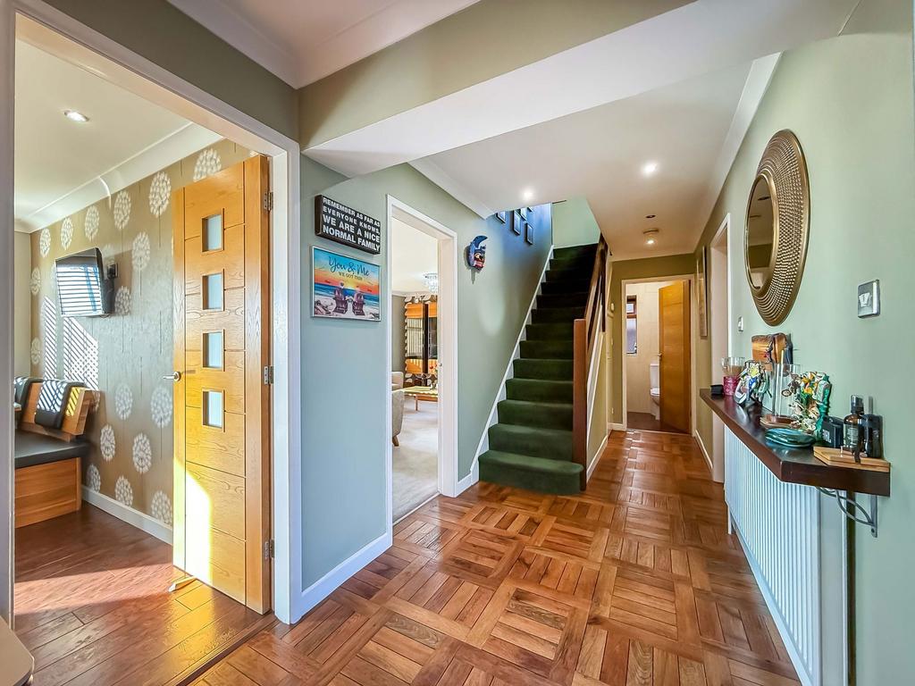 Feature metal outer door, double glazed side windows. 'Karndean' woodblock flooring, ranch style staircase to the first floor with useful storage cupboard below. Recessed spotlighting. Double door cloaks cupboard.