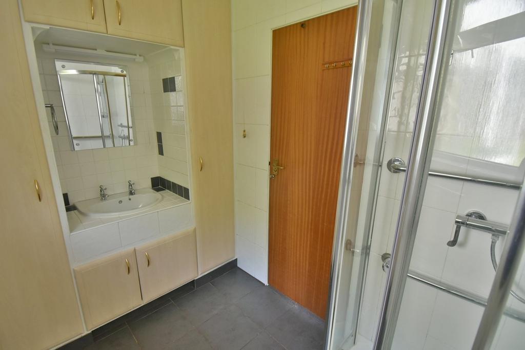 • Ground floor shower room comprising shower cubicle with chrome wall mounted shower unit and sliding doors, WC, vanity unit into a tiled recess with cupboards to both sides and below, double glazed window to the rear aspect