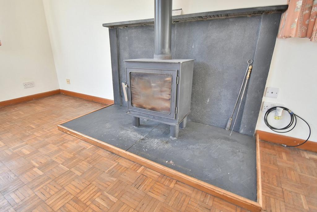 • Lounge/dining room is a spacious light and airy triple aspect room with a double glazed window to the front aspect and both sides, impressive centrally positioned wood burning stove with slate mantel backdrop and hearth, serving hatch to the kitchen, parquet flooring