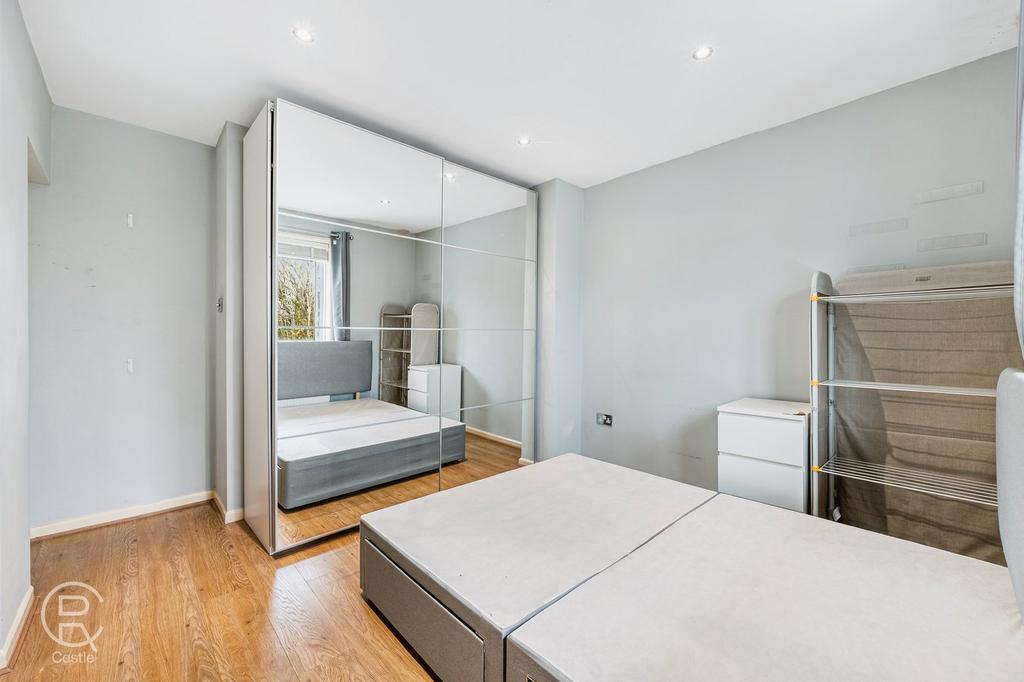 Inside, the property offers a smart layout comprising a spacious reception room with a large sash-style window allowing excellent natural light, a modern fitted kitchen with integrated appliances and breakfast bar seating, a double bedroom with built-in mirrored wardrobes, and a contemporary fully tiled bathroom with bath and shower over.