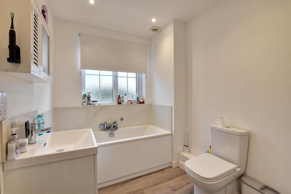 Bathroom - 2.29m x 1.96m (7'6 x 6'5) - Window to front, white suite comprising a deep double ended panelled bath with centre mounted tap, contemporary wash hand basin and low level wc, heated towel rail, shelved linen cupboard.