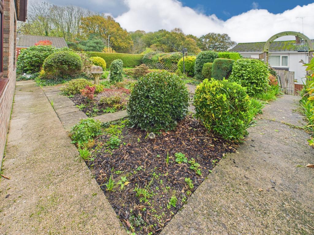 Driveway with garage, large patio area with slabbed pathways, pretty flower beds with mature shrubs and trees.