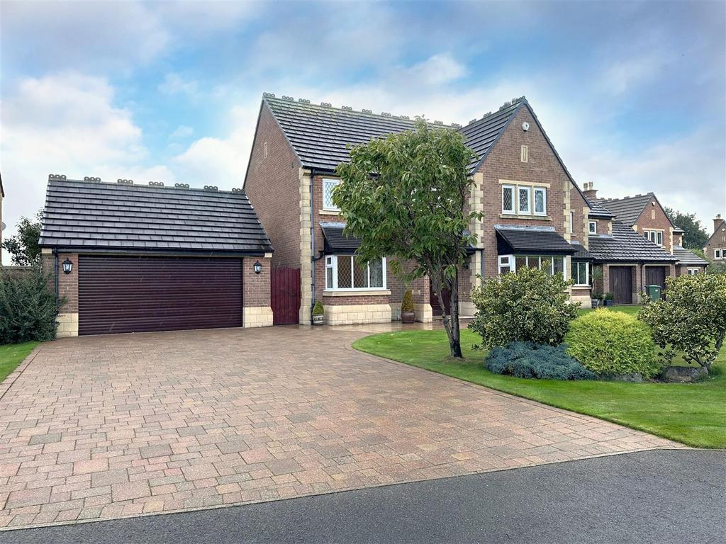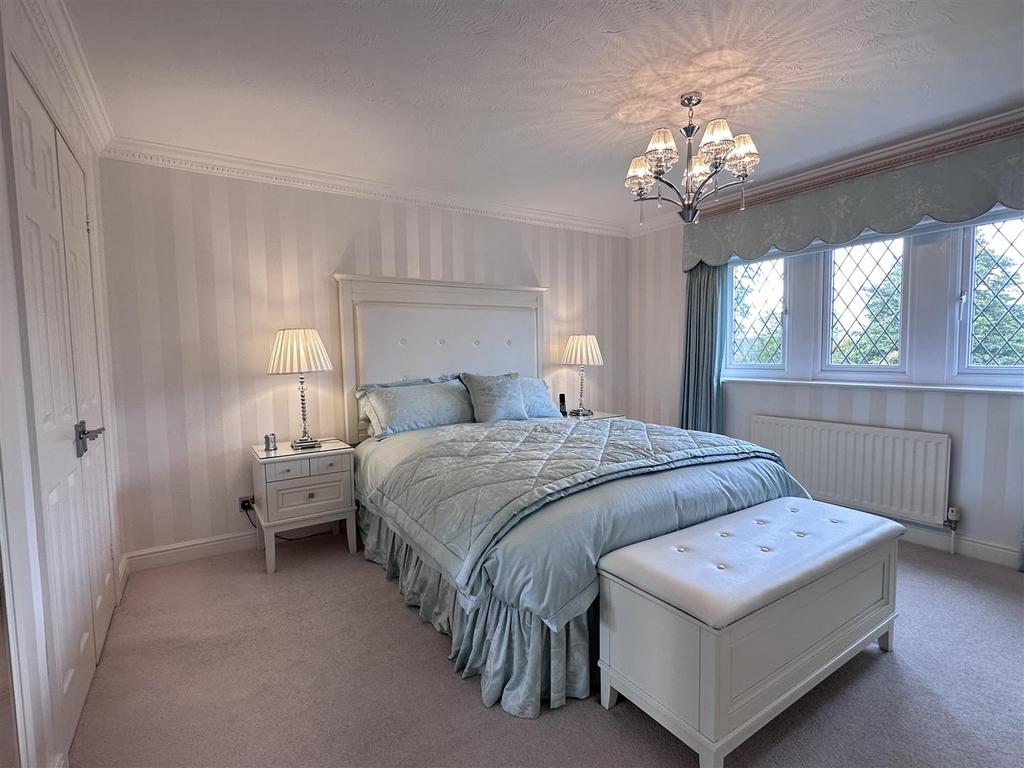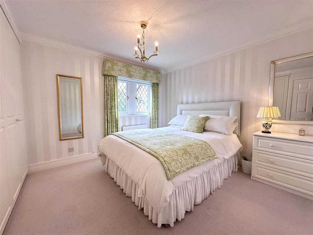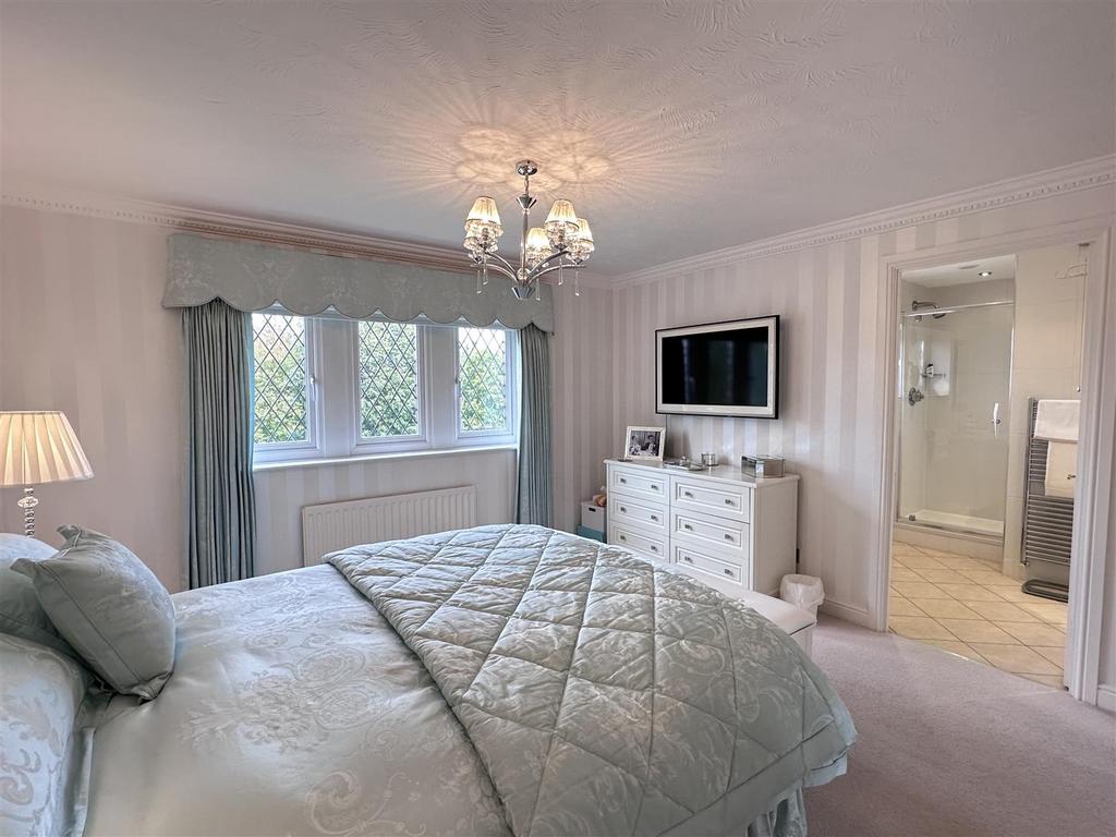 Set within approx a quarter acre, the outdoor space is a real highlight. The front garden is beautifully landscaped with a manicured lawn, overlooking an attractive greenbelt with mature trees. A spacious block paved driveway provides ample parking for up to six cars and leads to a detached double garage with an electric door. To the rear, a paved patio leads onto a carefully tended lawn, bordered by established plants, and offers stunning views.