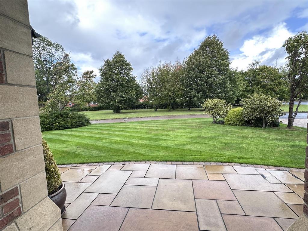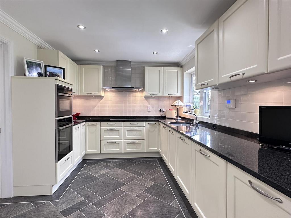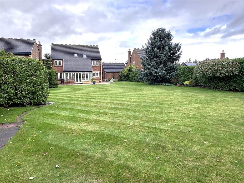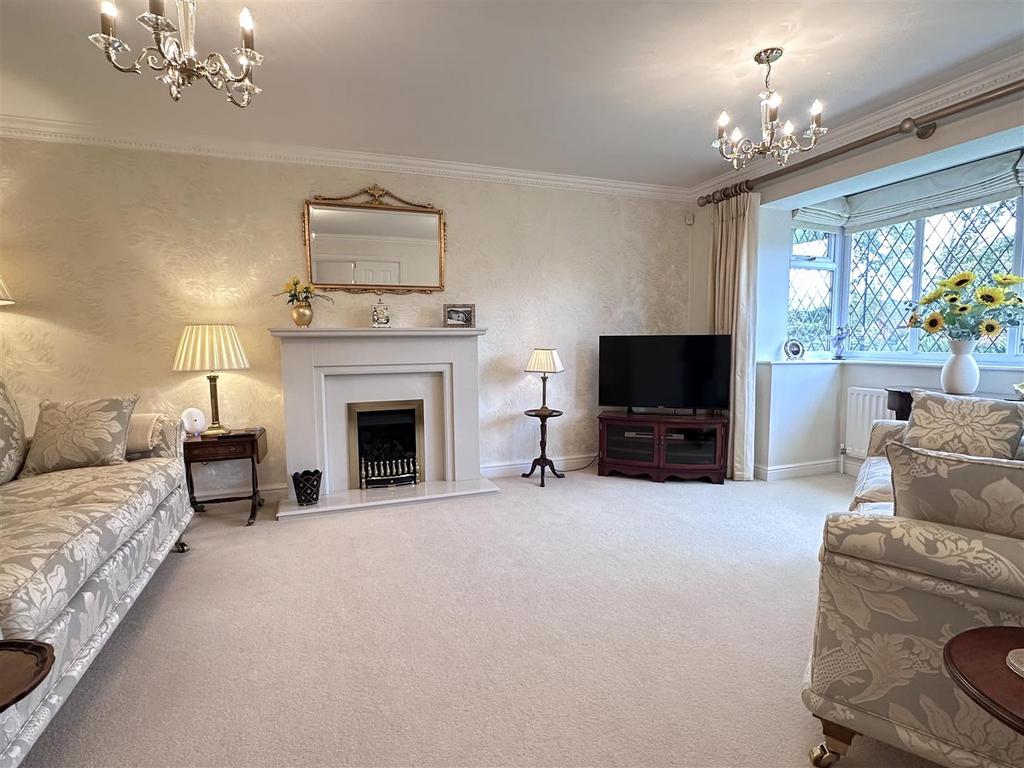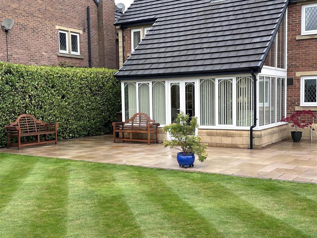 Set within approx a quarter acre, the outdoor space is a real highlight. The front garden is beautifully landscaped with a manicured lawn, overlooking an attractive greenbelt with mature trees. A spacious block paved driveway provides ample parking for up to six cars and leads to a detached double garage with an electric door. To the rear, a paved patio leads onto a carefully tended lawn, bordered by established plants, and offers stunning views.