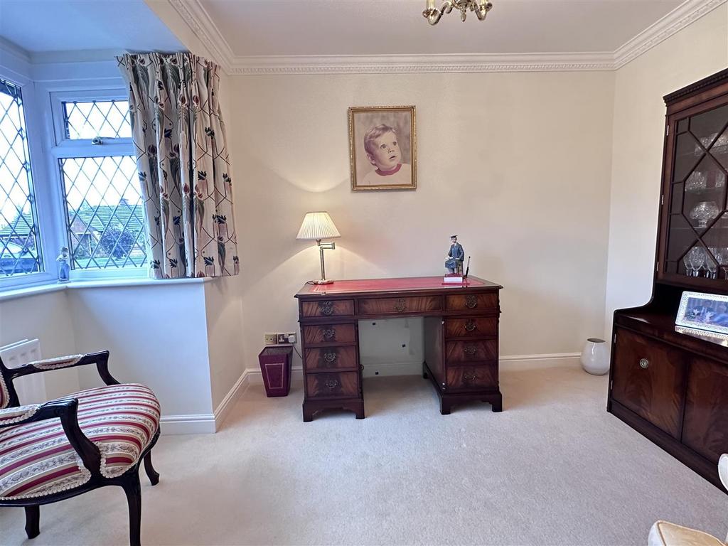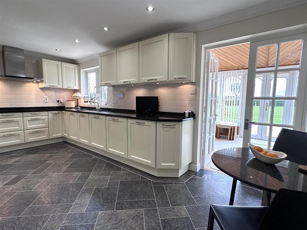 Upon entering, a charming storm porch opens into a hallway featuring a cloakroom and WC. The lounge features a bay window, and a beautiful fireplace. Double doors lead from the lounge into a formal dining room, with access to the garden room. The kitchen/breakfast room complete with a range of units, granite worktops, luxury Amtico flooring, and integrated Neff appliances, including a double oven, induction hob, fridge, and dishwasher. The attached utility room offers additional storage, sink, integrated washing machine, and freezer. French doors from the breakfast area open into the garden room, offering panoramic views over the meticulously landscaped garden and open fields beyond. Adjacent to the lounge is a study, perfect for home working, with its own feature bay window.
