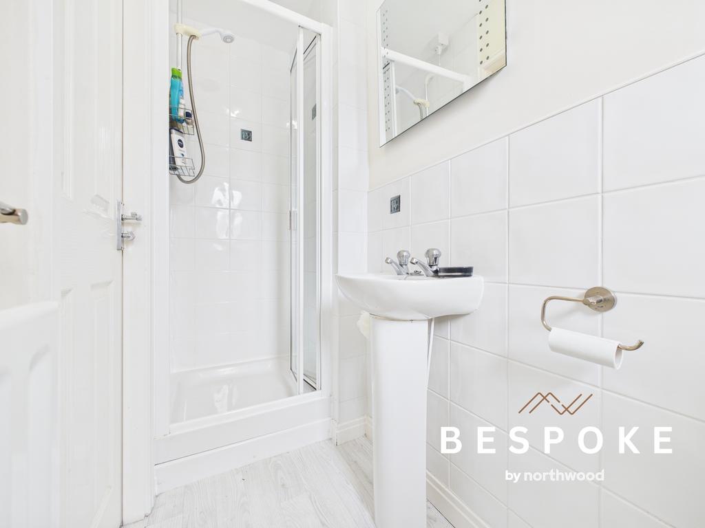 With a three piece suite comprising a double shower unit with an electric shower and re-tractable glass screen, pedestal hand wash basin and low level W/C. Partially tiled walls and vinyl flooring, wall mounted radiator, extractor fan and frosted uPVC double glazed window to the side elevation.