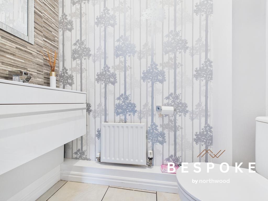 Fitted with a modern and stylish two piece suite comprising a low level W/C and vanity hand wash basin with a storage unit underneath. Tiled flooring, wall mounted radiator and extractor fan.